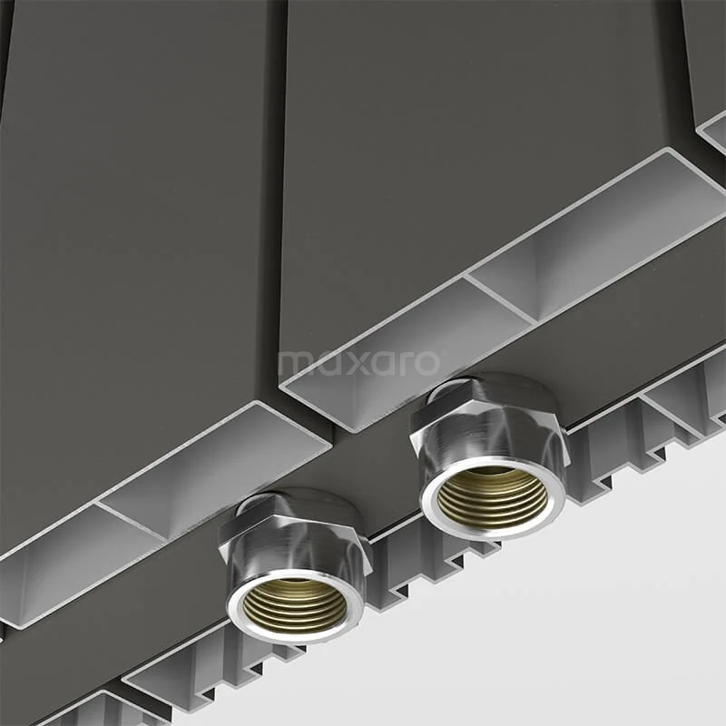 De radiator is voorzien van een rechthoekige vormgeving en heeft twee verschillende kanten. Dit unieke design bestaat uit een vlakke kant met lamellen en zijde met inkepingen, zodat u thuis zelf kiest hoe u de radiator ophangt. Daarnaast zorgt de donkergrijze metallic afwerking met subtiel aangebrachte glinstering voor een schitterende en luxueuze touch.