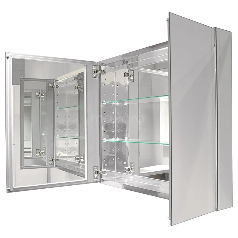 Dit tijdloze exemplaar is uitgevoerd in aluminium en heeft een rechthoekig design. De kast beschikt over spiegels aan de voor- en zijkant, op de binnenzijde van de deur en zelfs op de achterwand. Door het tijdloze uiterlijk komt de spiegelkast in elke badkamerstijl tot zijn recht. Bovendien zorgen de spiegels voor een ruimtelijk effect in uw badkamer.