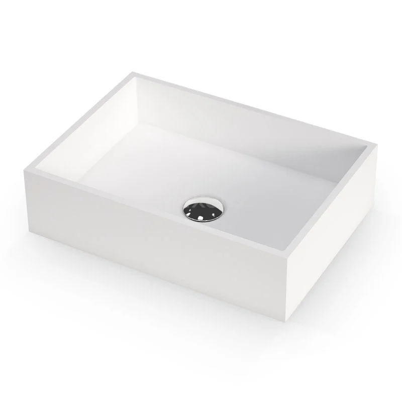 Met deze waskom uit de Mintra-serie voorziet u de badkamer van een chique uitstraling. De waskom is gemaakt van solid surface. Dit materiaal staat bekend om zijn zachte en matte look. Hiermee geeft u de ruimte een bijzondere touch. Ervaar daarbij ultiem onderhoudsgemak, want krassen en vlekken zijn gemakkelijk te verwijderen met een schuurcrème of een licht schuurpapier. Verder heeft dit model een strakke, rechthoekige vormgeving.